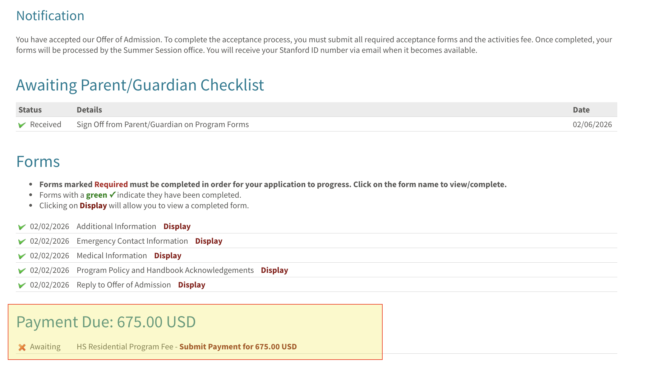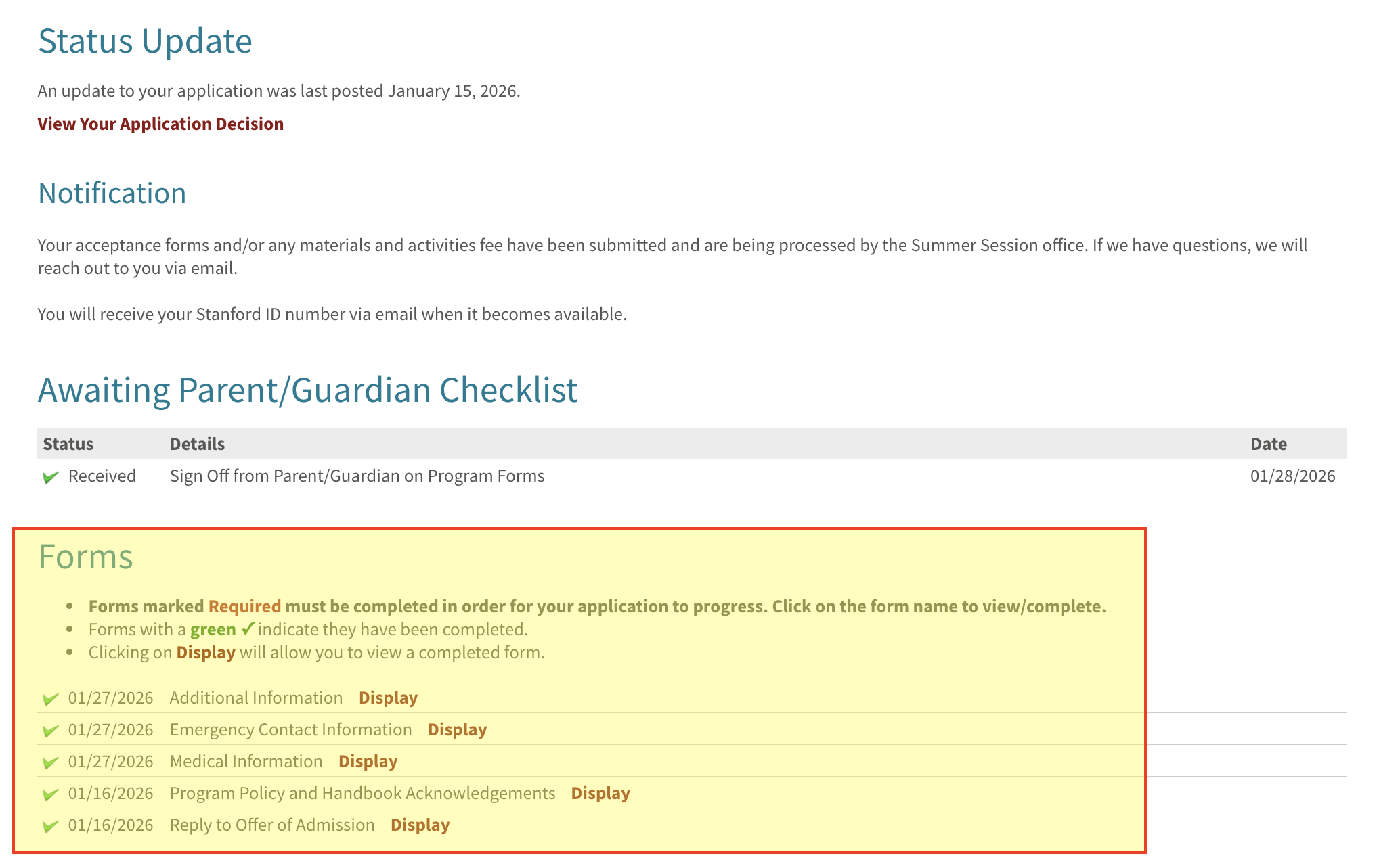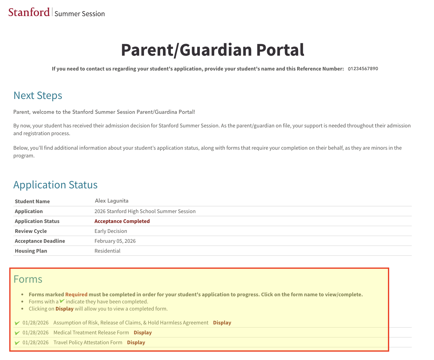 | Program Policies Acknowledgement | Review and acknowledge all important program policies, including Summer Session Program Handbook, Stanford's Fundamental Standards and Honor Code, Residential Agreement, and Health Requirements. |